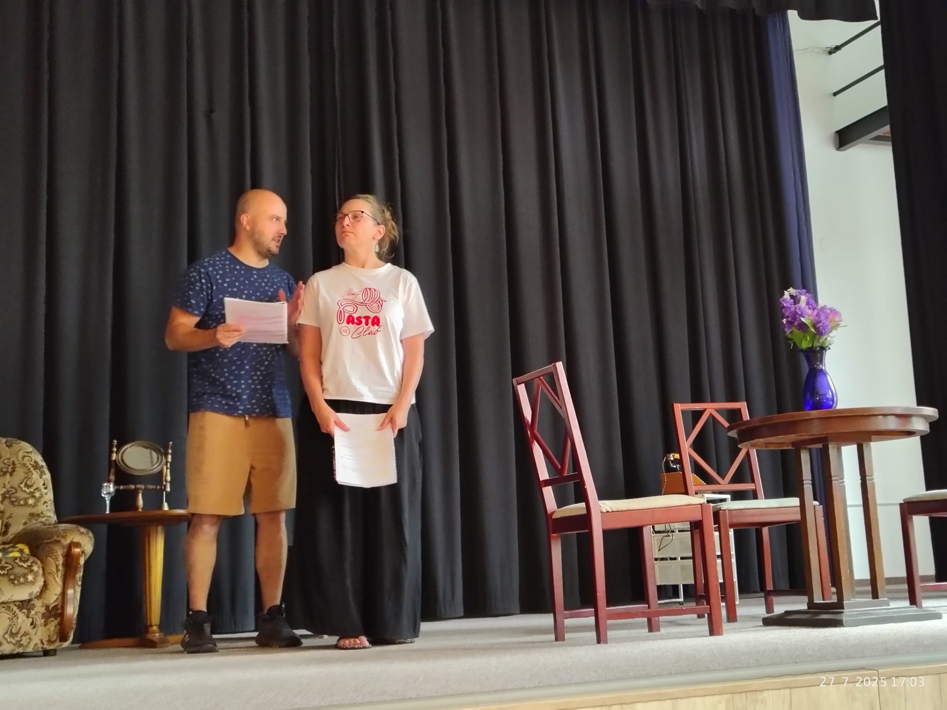 Zdravím všechny příznivce našeho divadelního souboru. Stále probíhají divadelní zkoušky na novém představení. Přesto, že jsou divadelní prázdniny, podařilo se nám se sejít na zkoušce v červenci. Tím jsme se přehoupli do druhé poloviny představení. Čeká nás ještě mnoho práce a úsilí. Zkoušky se rozběhnou opět v září.
